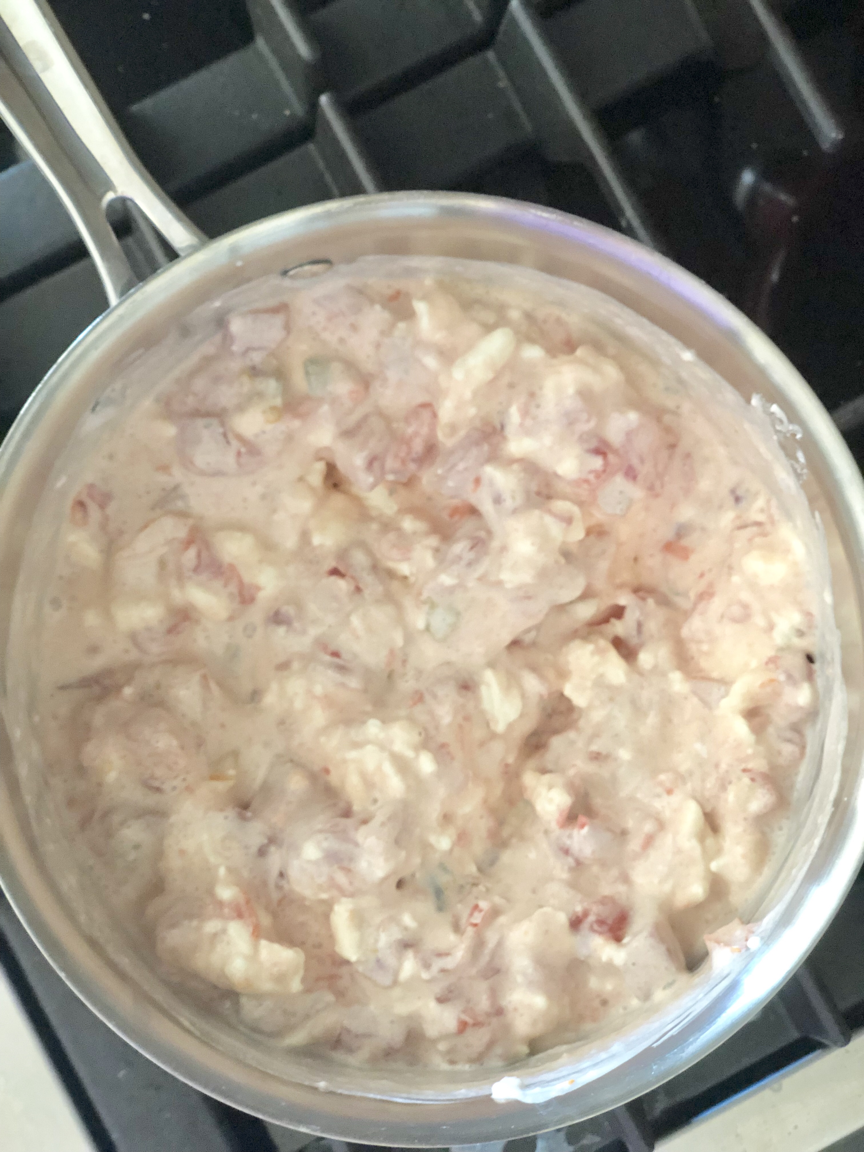So first you’ll want to pre-heat your oven to 375. Mash up your cream cheese with a fork, and then stir in the drained RO*TEL. Transfer the RO*TEL mixture to a medium pan on stove top with medium heat. Heat it up, stirring occasionally, just til the cream cheese is well melted and blended into the RO*TEL. Once melted through, turn off heat and set aside.