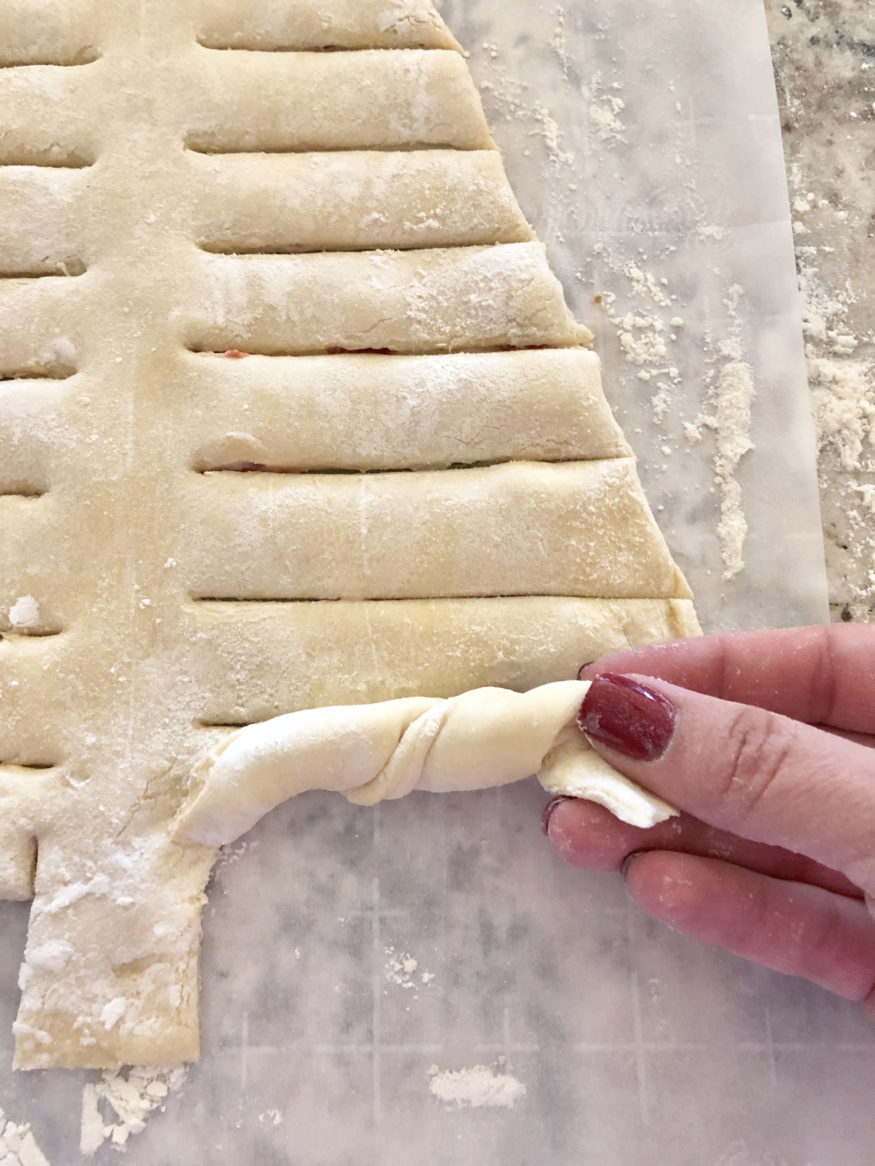 Now you can use a piece of parchment with an outline, or you can just gently “draw” in your lines using a knife or pastry cutter, or even a pizza cutter. I do it once just barely pressing so I can see a line, but not cutting through.