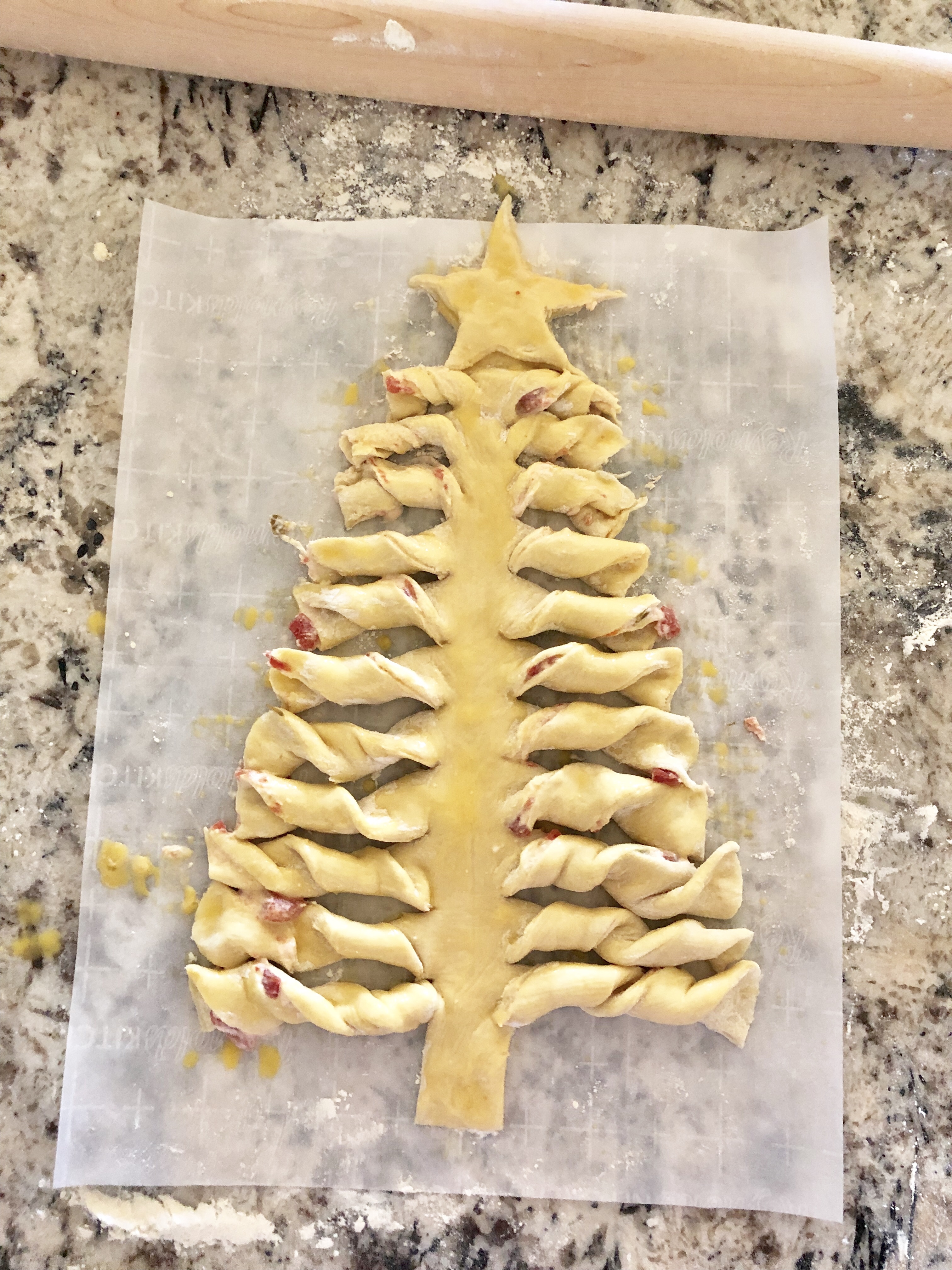 Whether you are using a “milk” and maple “egg wash” or a traditional egg wash, go ahead and gently brush the egg wash on top of the tree covering all face up portions.