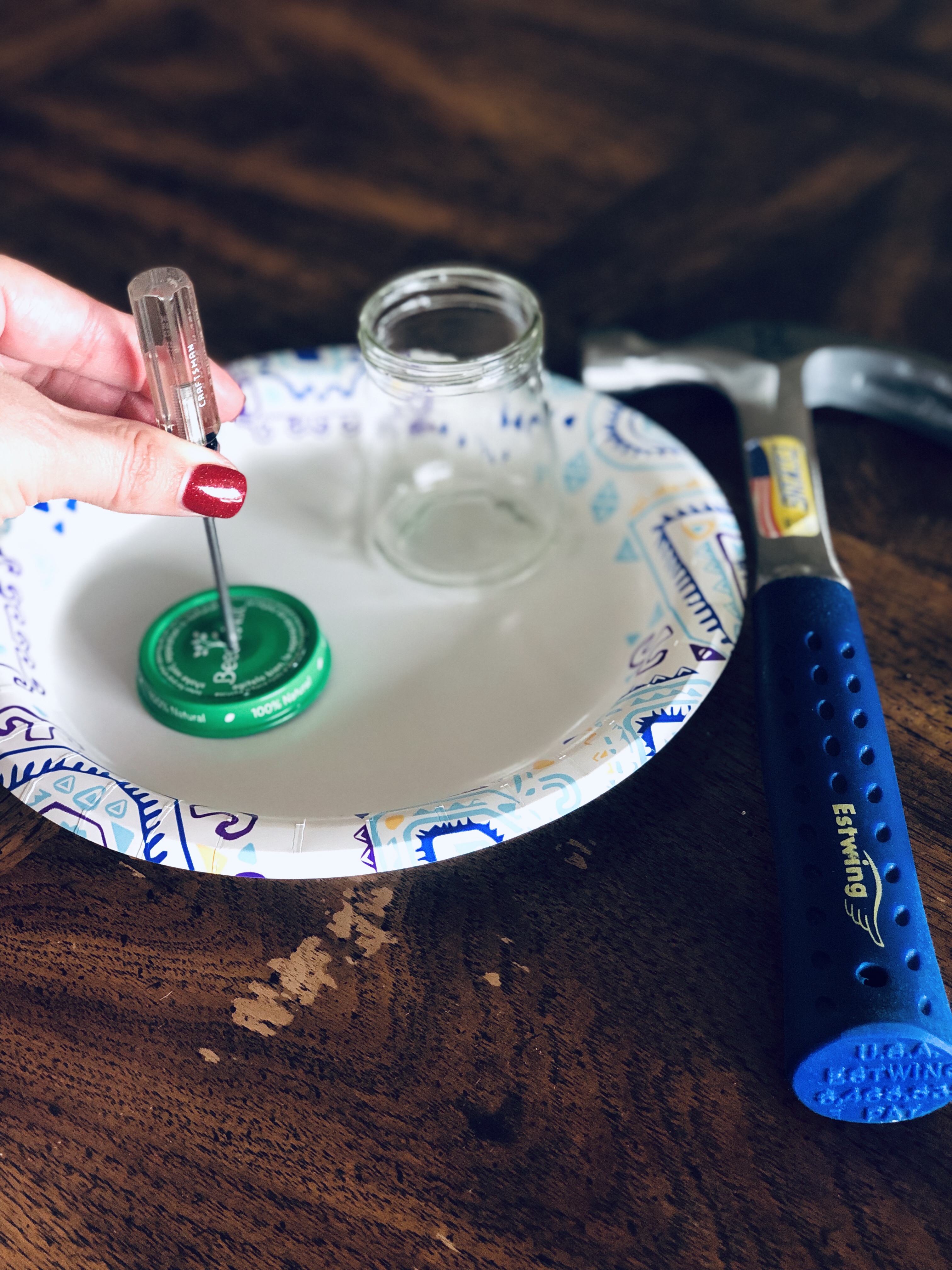 Next, you’ll poke a hole in the lid with a nail or a phillips head screwdriver, and a hammer.