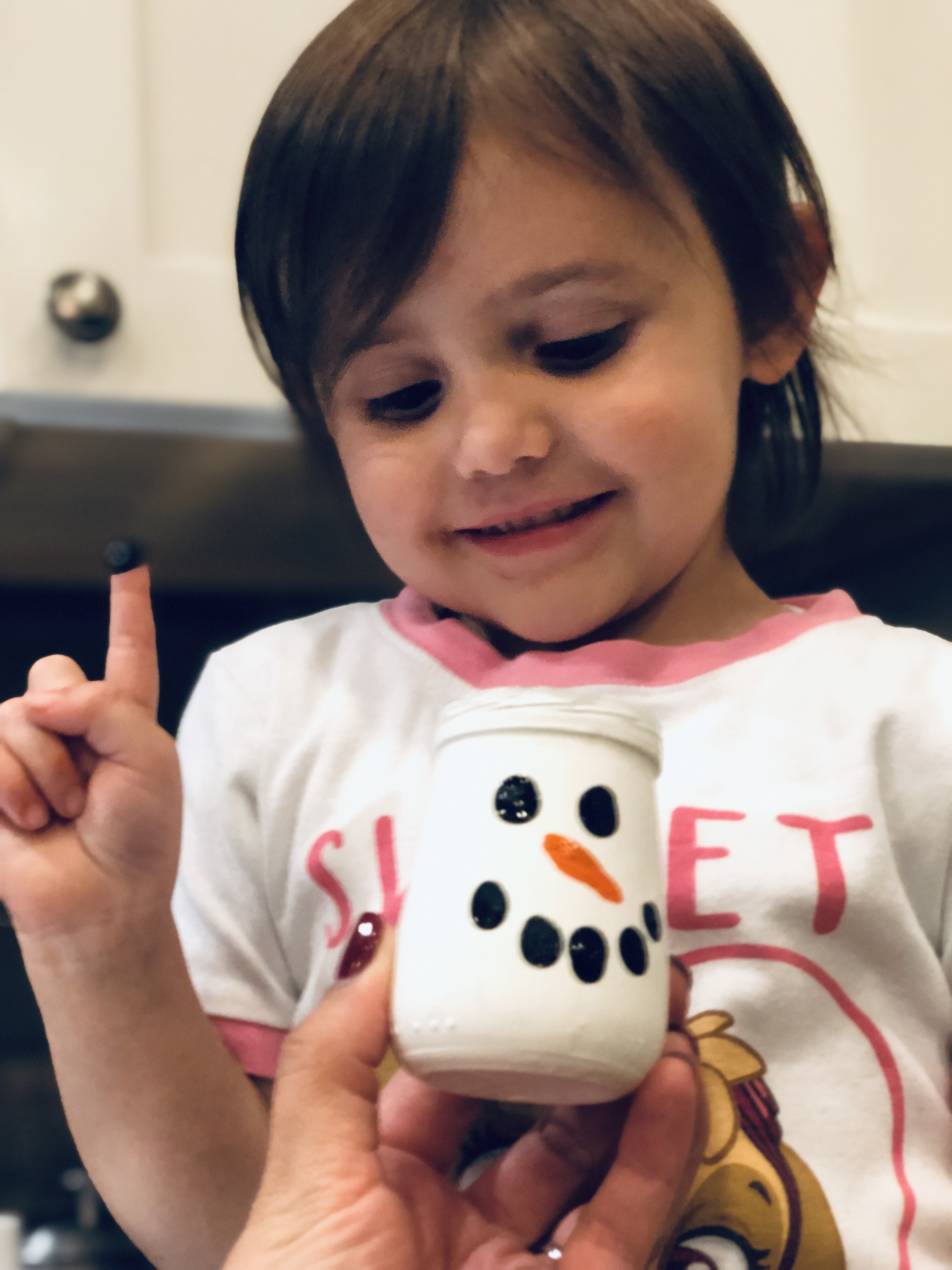 Now for the fun part! Use the children’s little fingers dipped in paint for the charcoal eyes, mouth, and carrot nose! To get the carrot nose, use the side edge of their pinky. For the eyes and mouth use the tip of a small finger.